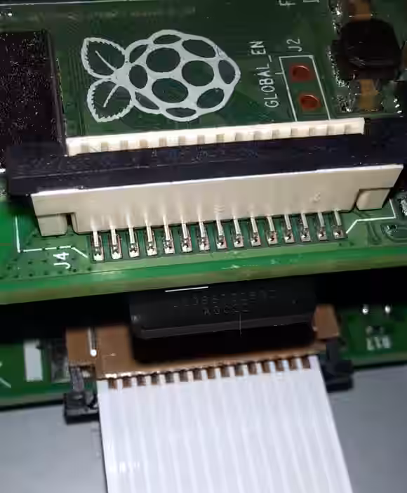 On the bottom (display) PCB, the silver contacts of the cable should be at the top (facing the Raspberry Pi):