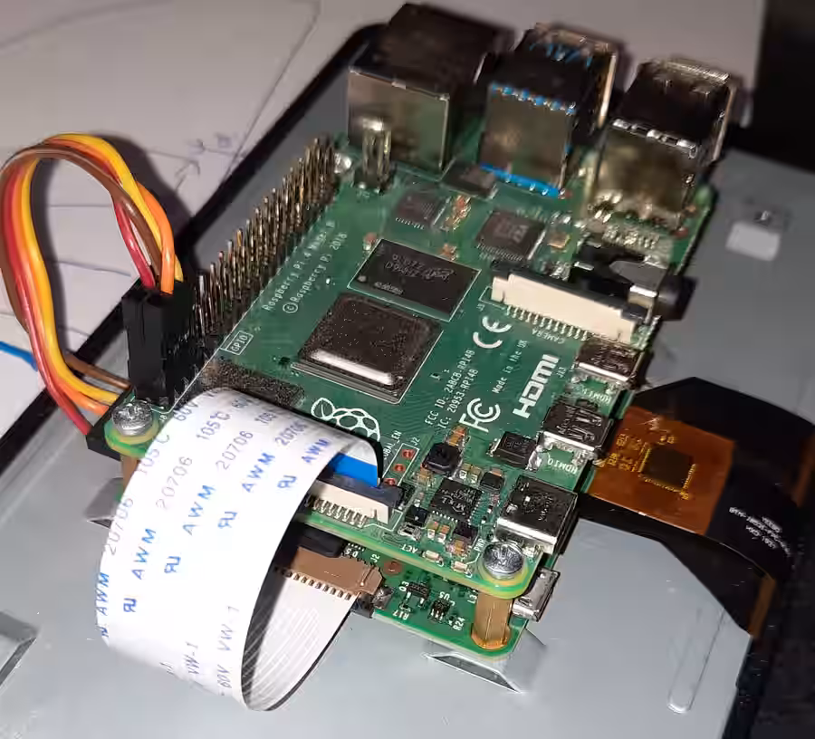 First, mount the Raspberry Pi on top of the display PCB on the back of the display.